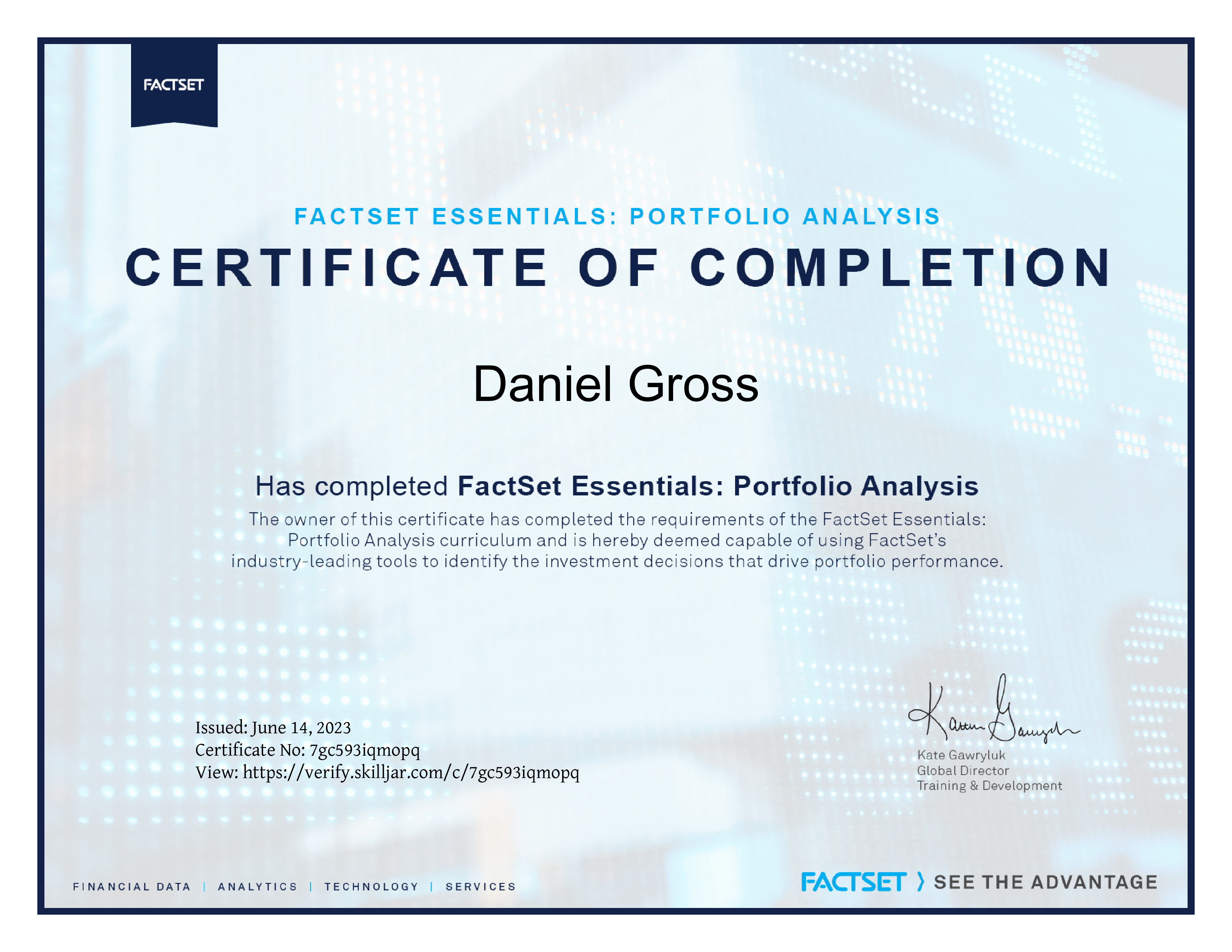 | Course Completed | FactSet Essentials: Portfolio Analysis |