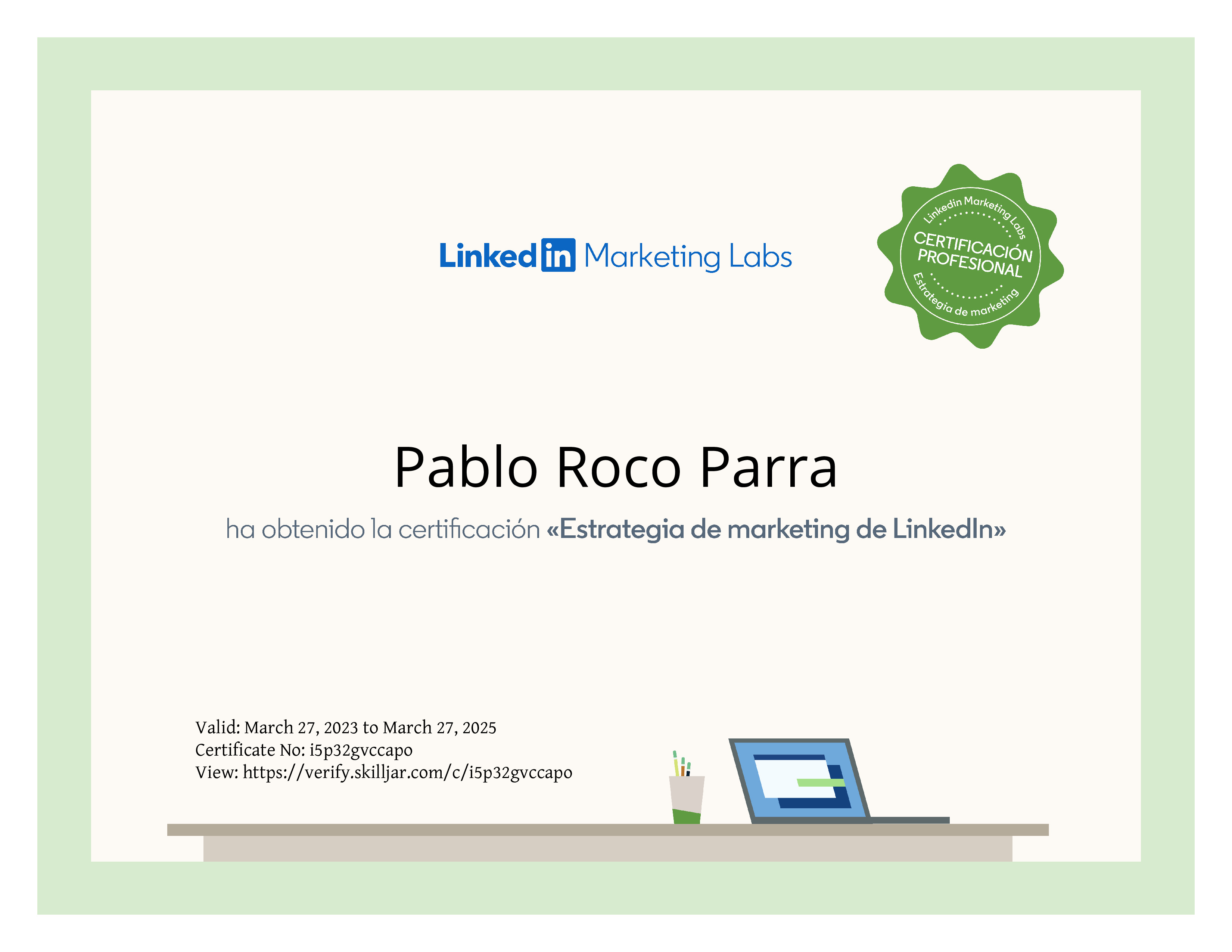 | Abgeschlossener Kurs | Certificación «Estrategia de marketing de LinkedIn» |