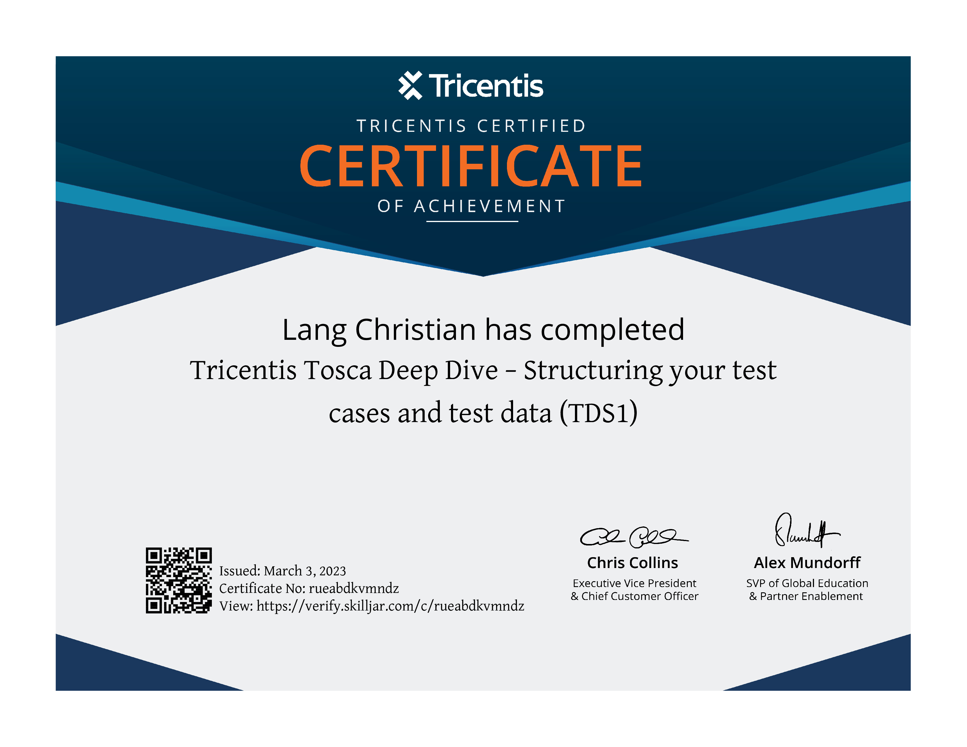 | Course Completed | Tricentis Tosca Deep Dive − Structuring your test cases and test data (TDS1) |