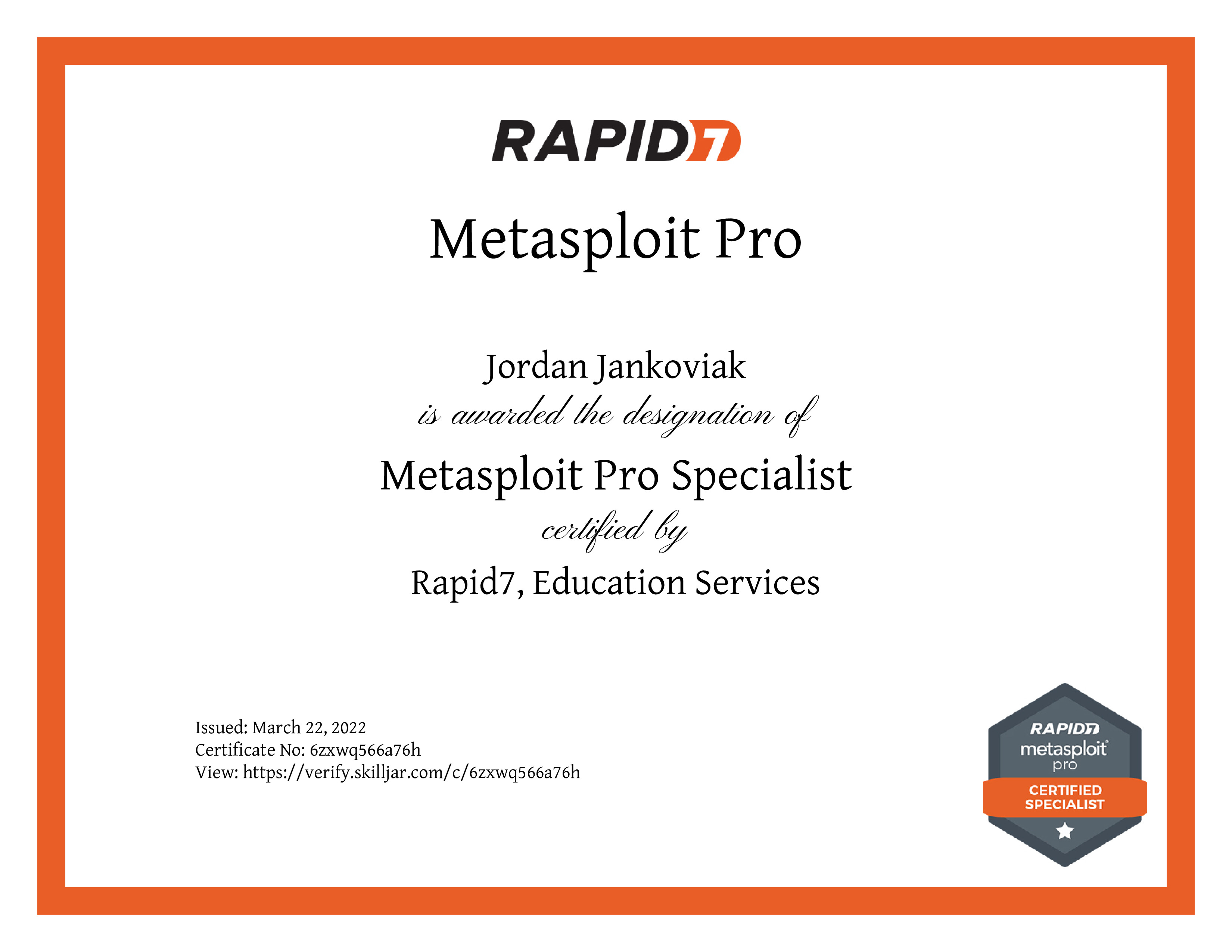 | Course Completed | Metasploit Pro Certified Specialist - Dedicated Training Class (Whirlpool Corporation March 17-18) |