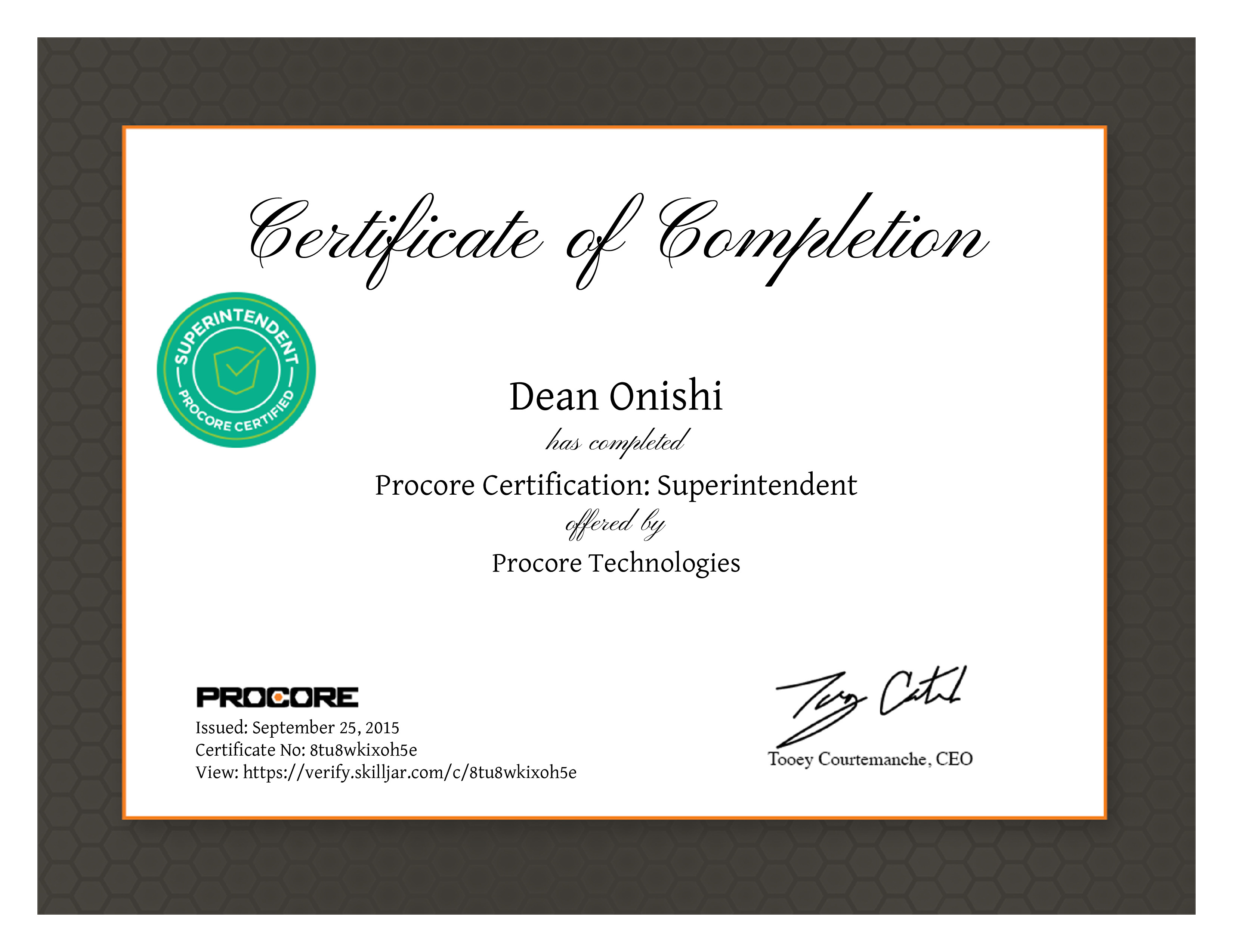 | Curso completado | (ARCHIVE) Procore Certification: Superintendents - Deprecated |