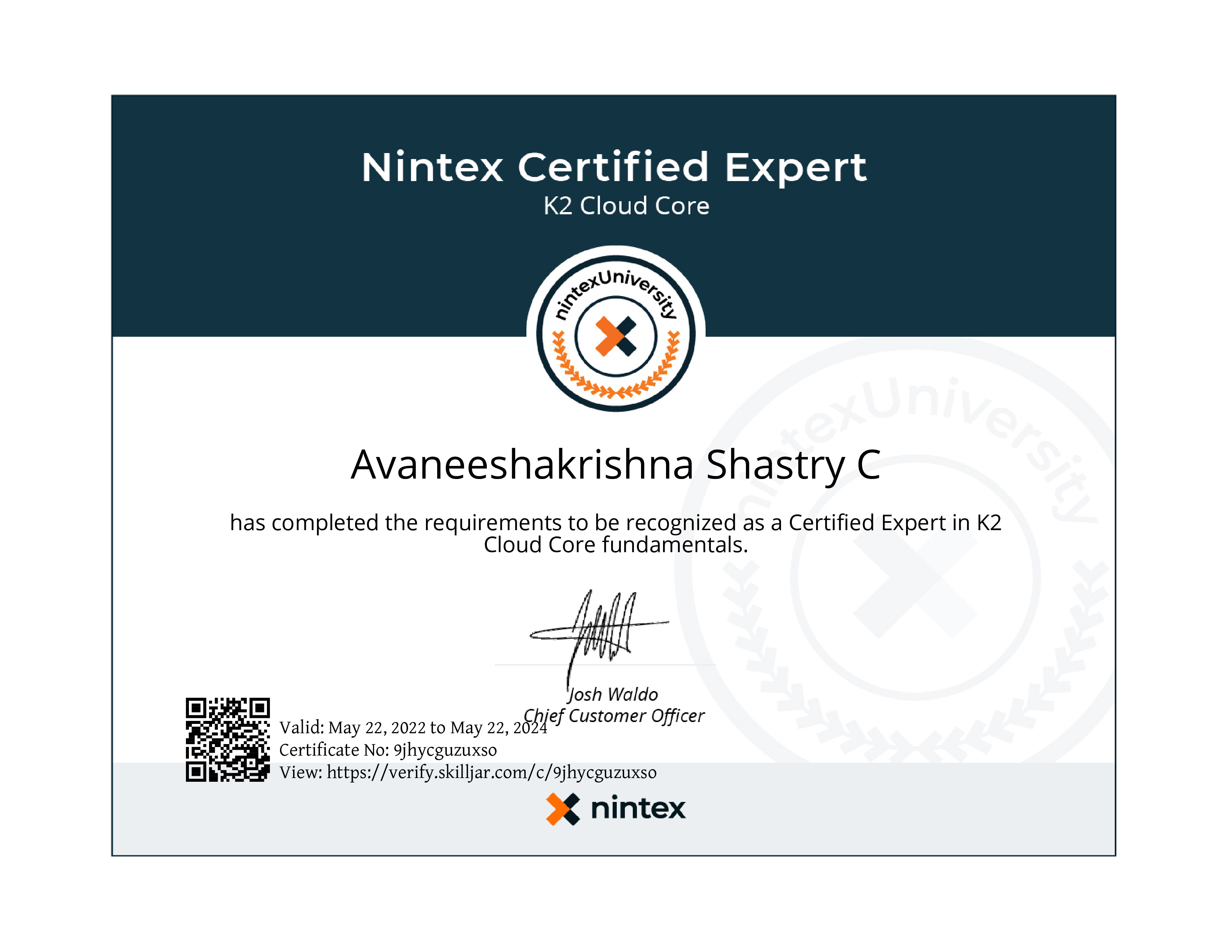 | Course Completed | Certification: K2 Cloud Core - Expert |