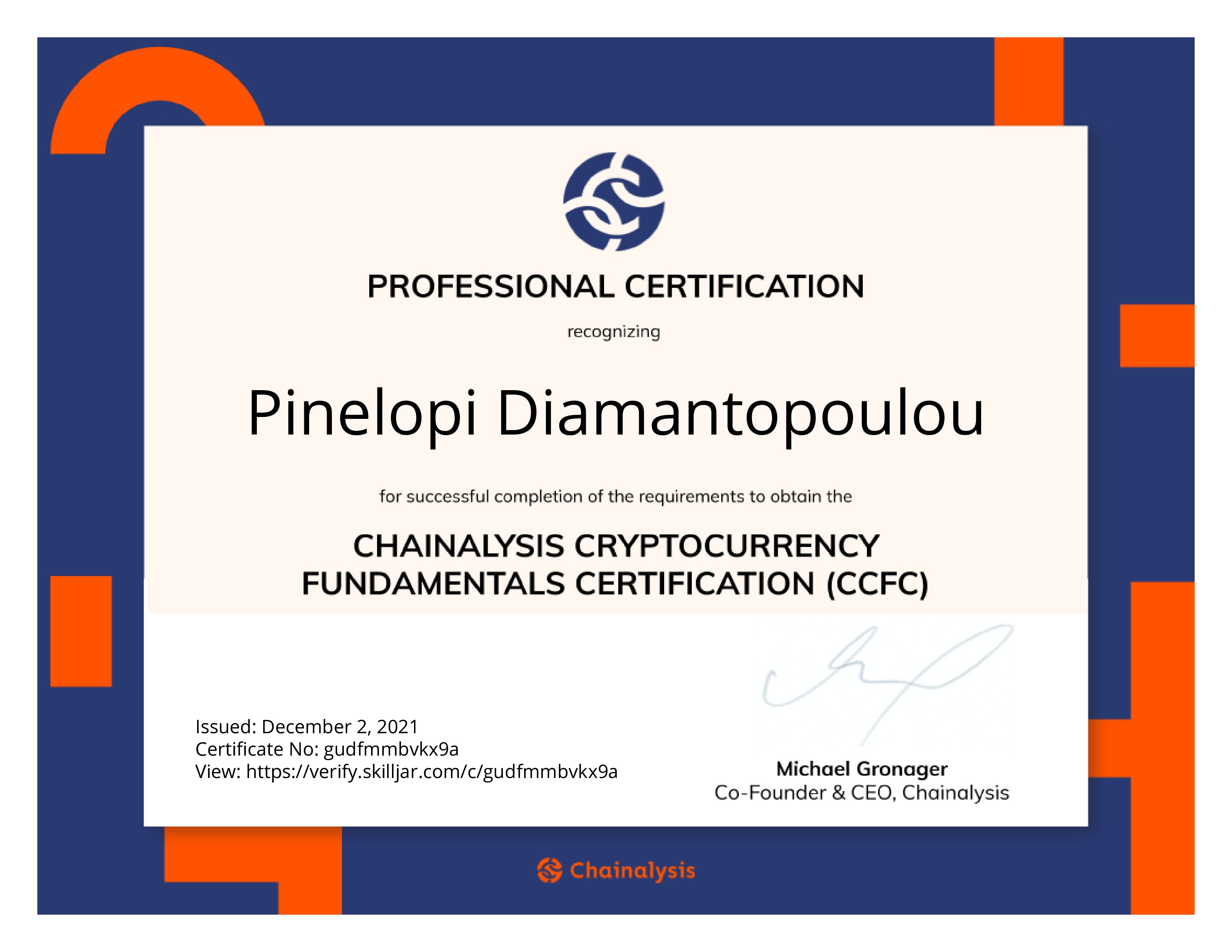 | Course Completed | Chainalysis Cryptocurrency Fundamentals Certification Exam |