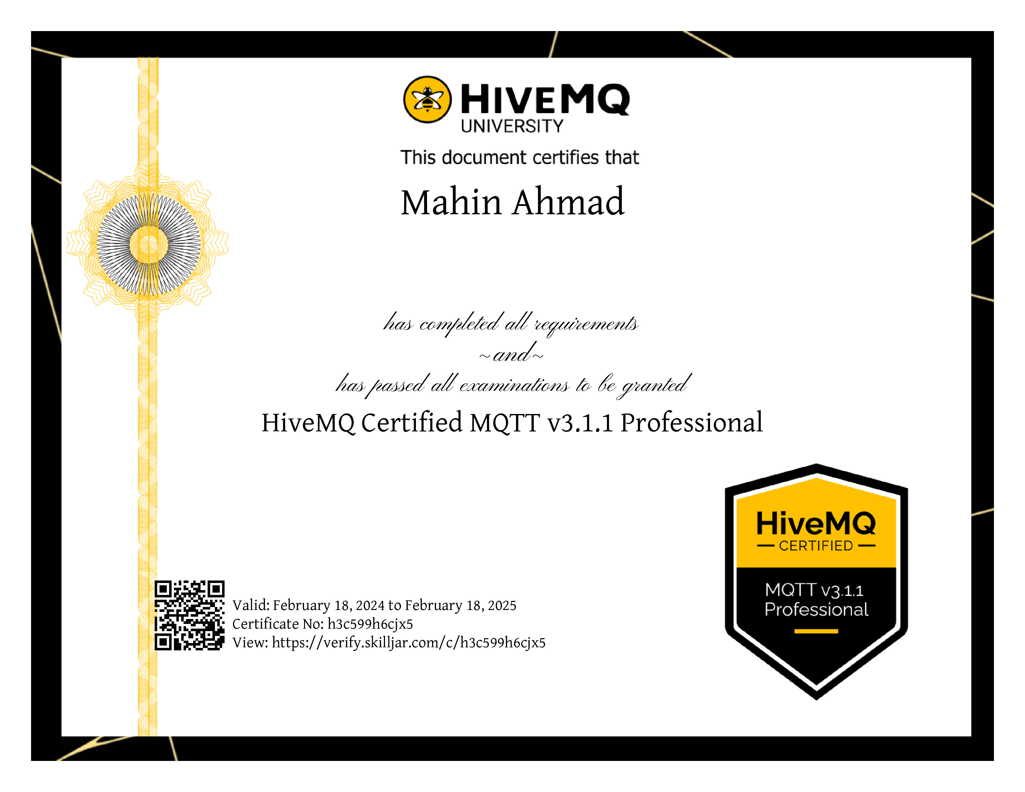 | Course Completed | HiveMQ MQTT v3.1.1 Professional Certification Exam |