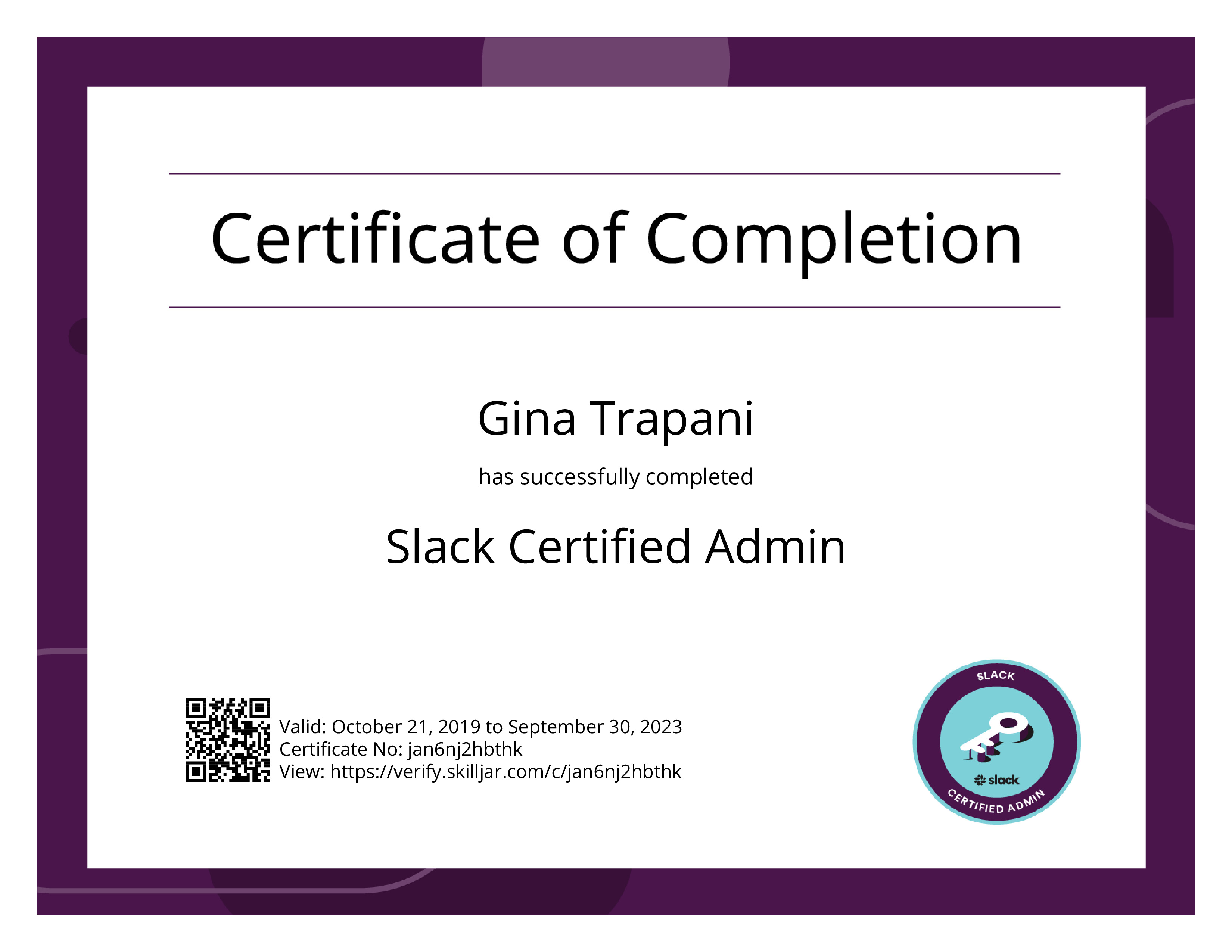 | Course Completed | Slack Certified Admin Exam [2019 Live Version] |
