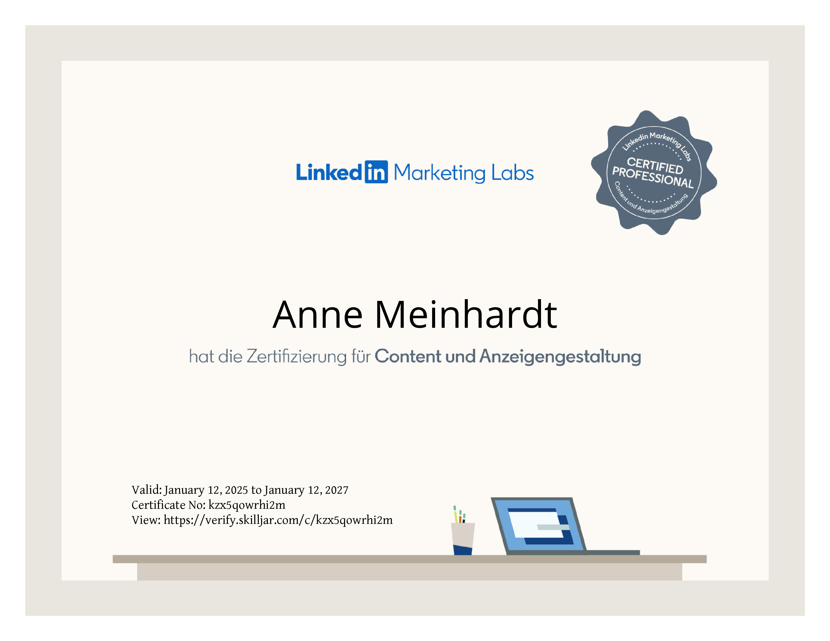 | Abgeschlossener Kurs | LinkedIn Zertifizierung für Content und Anzeigengestaltung |