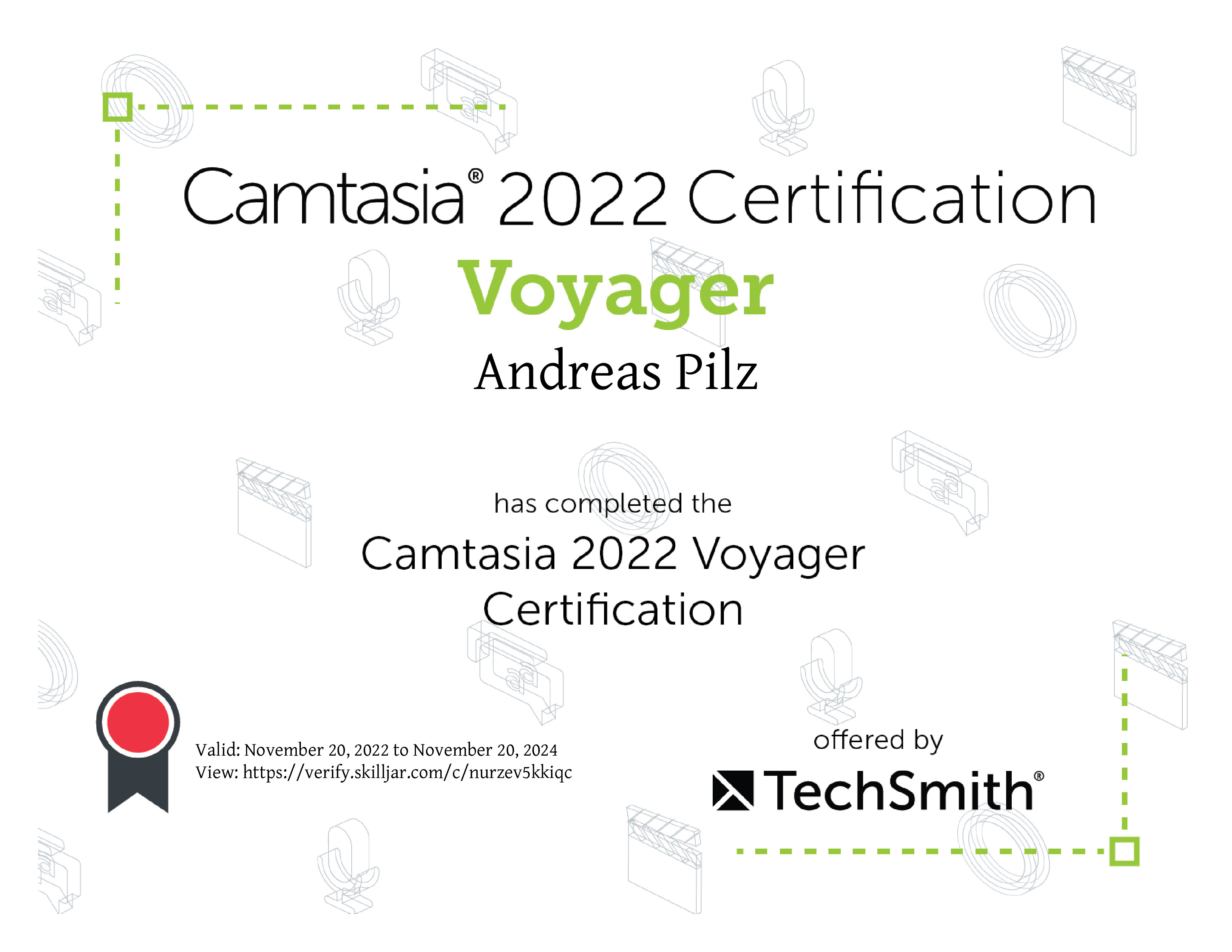 | Course Completed | Camtasia Voyager Certification (Test Only) |