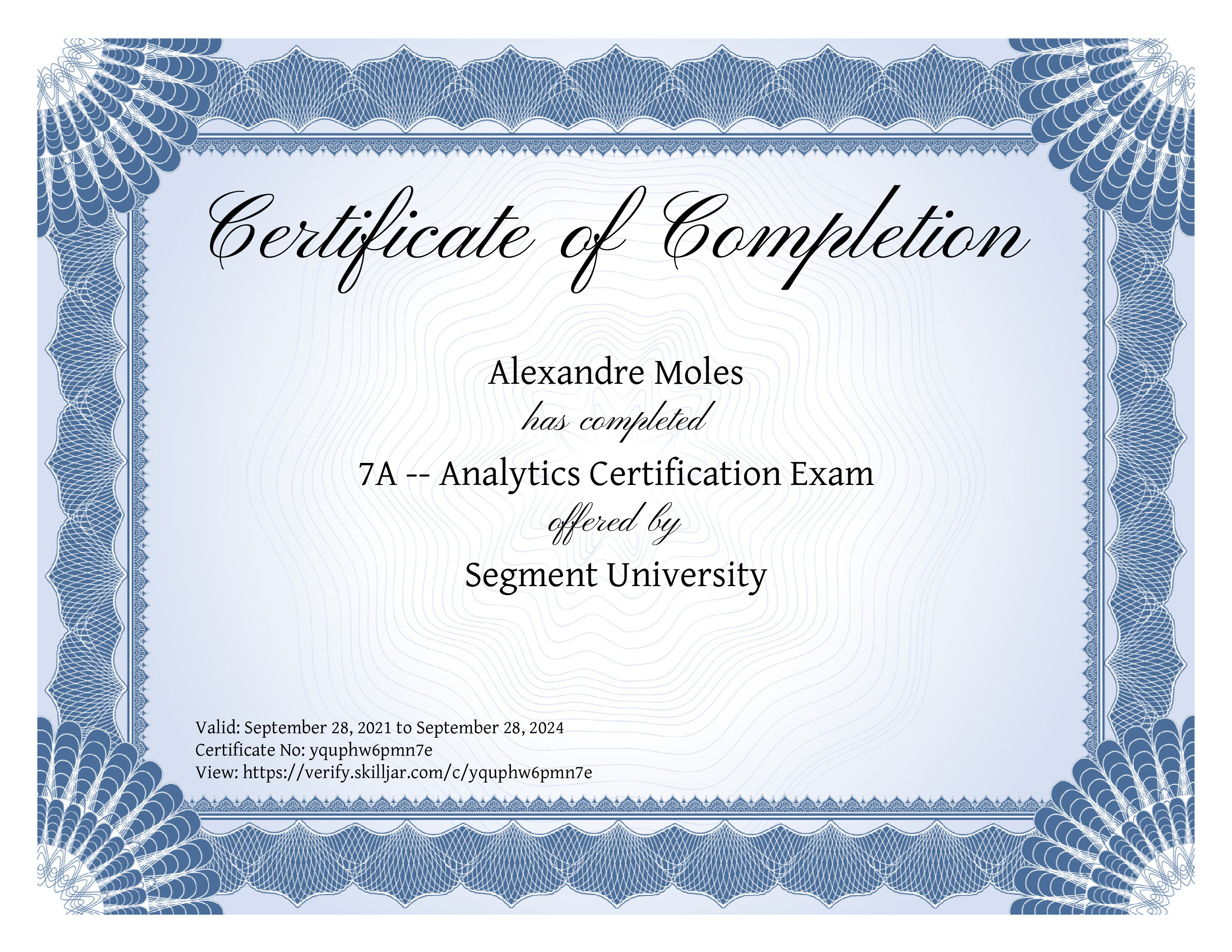 | Course Completed | 7A -- Analytics Certification Exam |